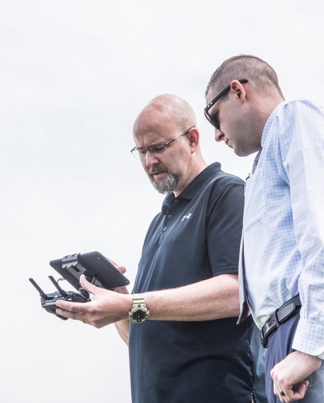 - Master Deputy Paul Cox (right) tries his hand at the drone controls while Master Deputy Detective Doug Reese looks on. Photo by Phil Grout