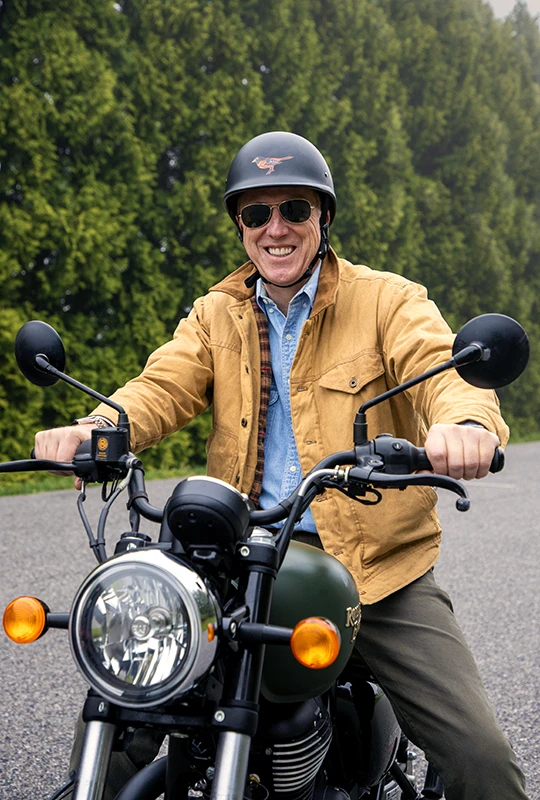 Damian Halstad toured around on a small Yamaha as a young teenager. About 18 months ago, he picked it up again, partly for nostalgia and enjoyment. He took a course and bought a Royal Enfield Meteor, which he rides around the area for an hour or two on weekends.