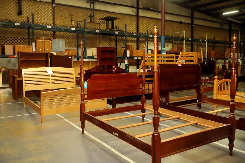 Beyond the showroom, the store is well organized by item type. More china cabinets, some with china sets, lined the walls, and the center housed nearly 100 sofas, loveseats and chairs of varying fabrics and sizes. There’s a “Ravens room” with purple couch and loveseat, and compatible entertainment center, coffee table and even football-themed glassware. Further into the warehouse sit hundreds of additional furniture pieces including dressers, desks, table and chair sets, bed frames and more.