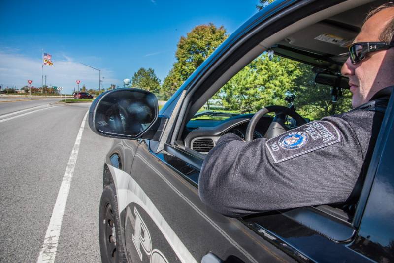 - Cpl. Brian Shaffer of the Taneytown Police Department checks traffic through the Rt. 140 roundabout at the edge of town.