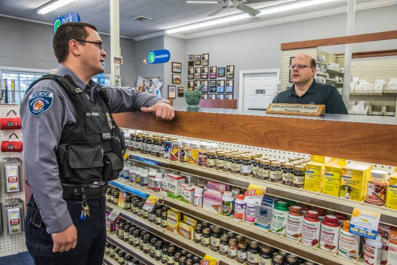 “It’s not uncommon for me to see the police in the parking lot when I’m closing,” Gleespen said. He points out that the officers aren’t there just to watch over him. The shopping center parking lot where the pharmacy is located is on Main Street, so the police can watch traffic and respond quickly to any calls. Seeing the officers there gives Gleespen peace of mind about his and his employees’ safety.