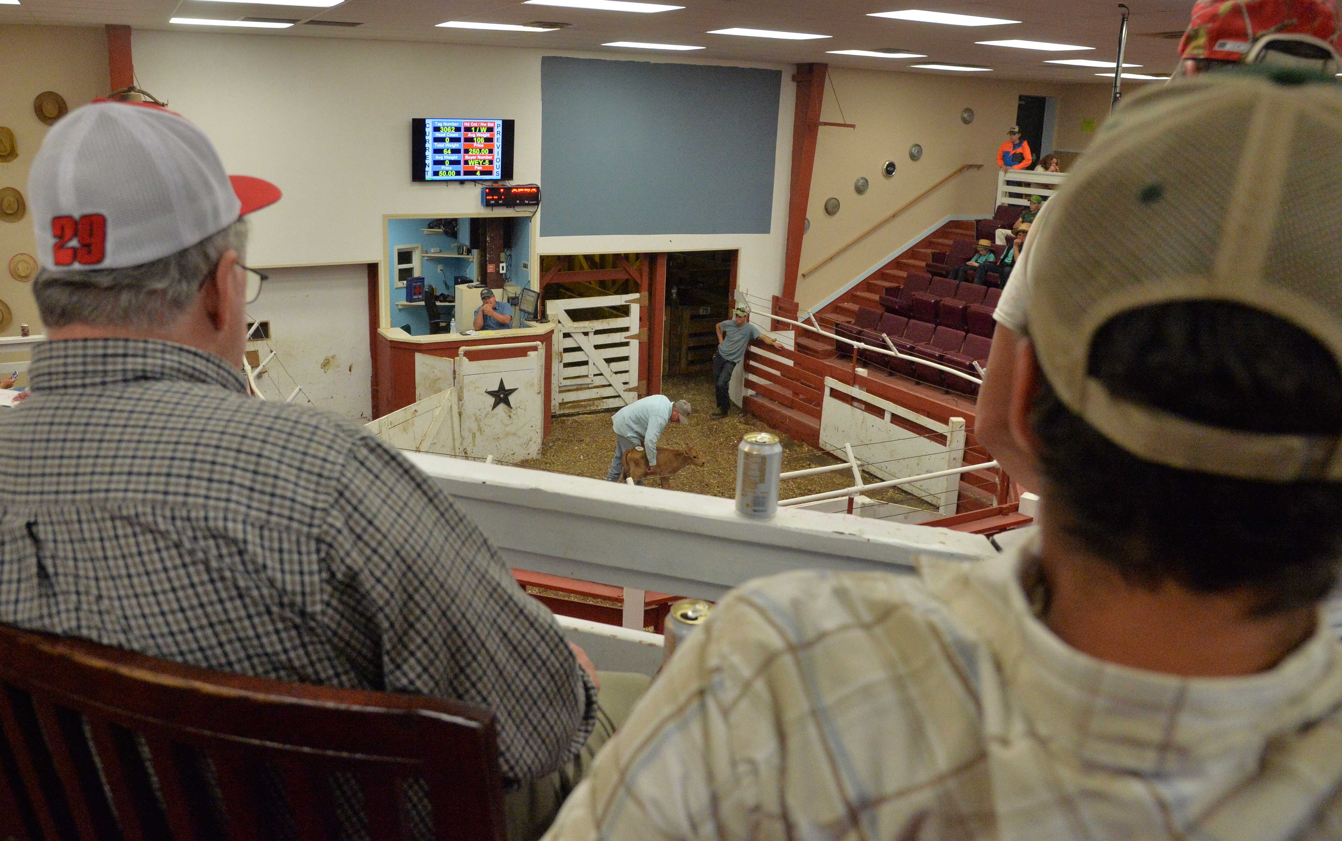 Around 6 p.m., a projector screen in the bidding room that had been showing the television series “Yukon Men” was switched off. Buyers settled in, some on the 150 cushioned stadium-style seats, and the rest behind them at high chairs and restaurant tables. A few snacked on fare from The Stock Pen. They all looked downward over a red fence as the livestock came out.
