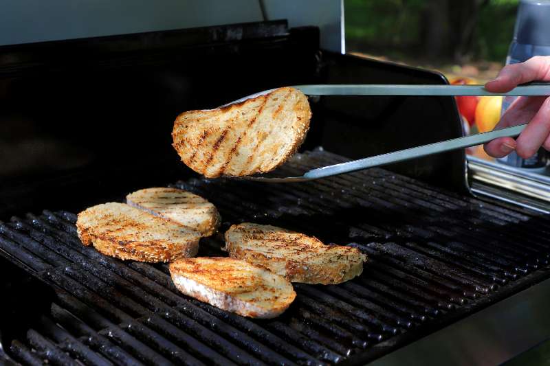 4. Brush bread slices lightly with olive oil; arrange bread slices in a single layer on grill racks. Grill for about 2 minutes on each side. Remove from heat and transfer bread to a serving platter.
