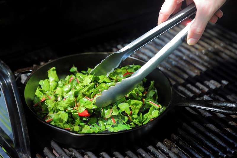 3. Heat 1 tablespoon olive oil in a cast-iron skillet over grill racks. Add Swiss chard, salt, pepper and garlic to pan; saute approximately 2 minutes until chard wilts slightly, stirring frequently.