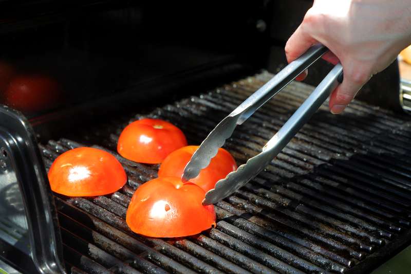 2. Cut tomatoes in half lengthwise; discard cores and seeds. Place tomato halves, skin sides up, on prepared grill racks. Grill for about 2 to 3 minutes per side. Remove from grill and let stand 5 minutes. Cut tomatoes into strips about 2 inches in length.