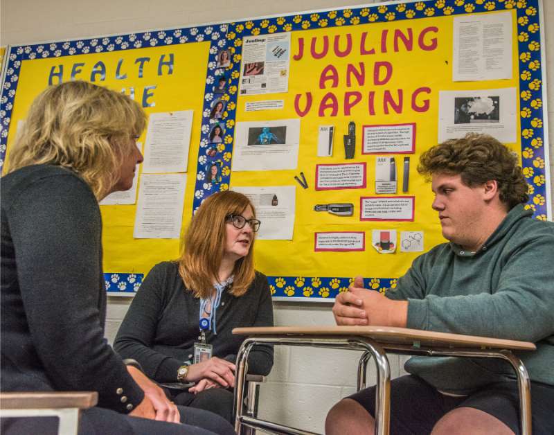 - Meghan Brown chats with Liberty High School senior Nic McCoy and Michelle Hodgkiss, a school secretary and parent, about the increased concerns of vaping among the local student community. – Photo by Phil Grout.