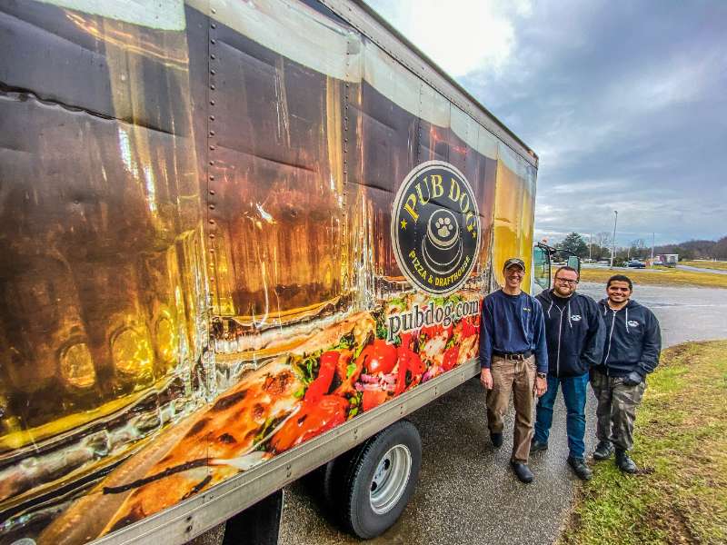 - George Humbert and his workers, Brian Archambault and Alvaro Cisneros, stand next to Pub Dogʼs delivery truck.