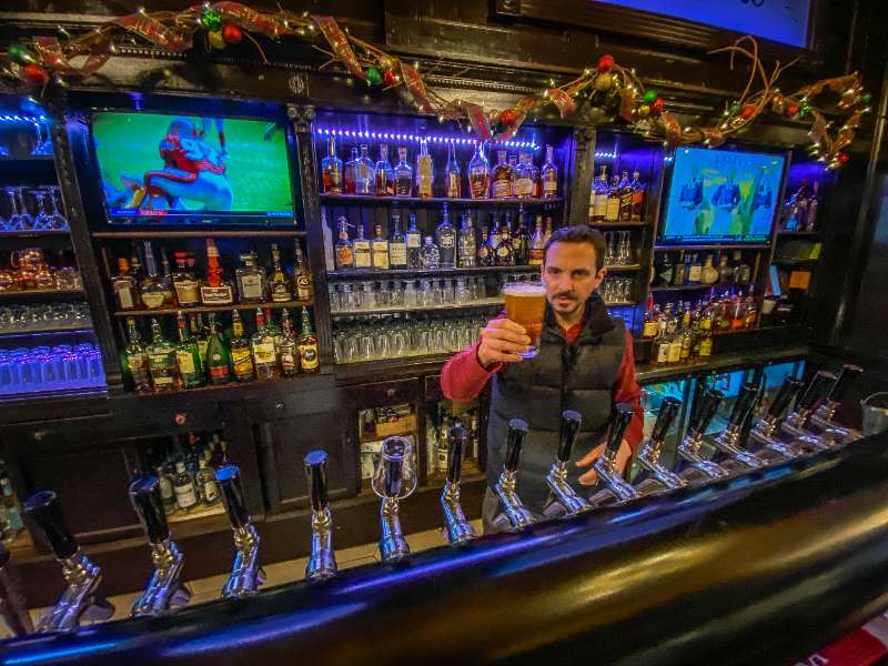 - Jay Lampart serves up a glass of his “Honest Ale” at the main bar in Johanssonʼs Dining House.