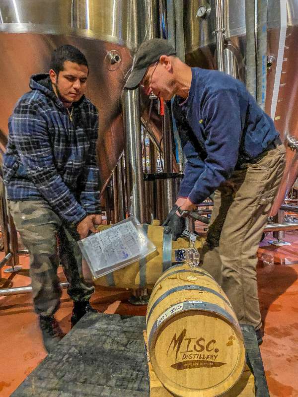 - Pub Dog’s George Humbert and Alvaro Cisneros move small oak barrels.
